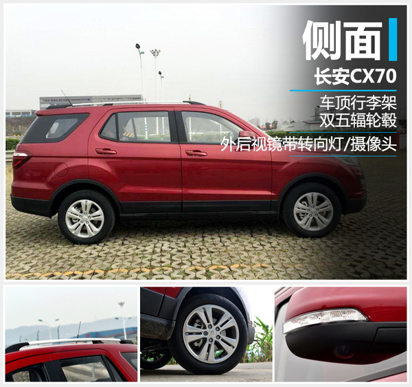 新车侧面十分硬朗,一条腰线从A柱一直延伸至车尾,并与尾灯相结合。在车顶位置CX70配备银色行李架,进一步增加新车的实用性和承载能力。从侧面来看,新车酷似福特探险者,C柱之后设有一个独立车窗,且采用了隐藏式D柱设计。CX70配备双五辐轮毂,在坑洼等路面行车时能够进一步减缓车身抖动。