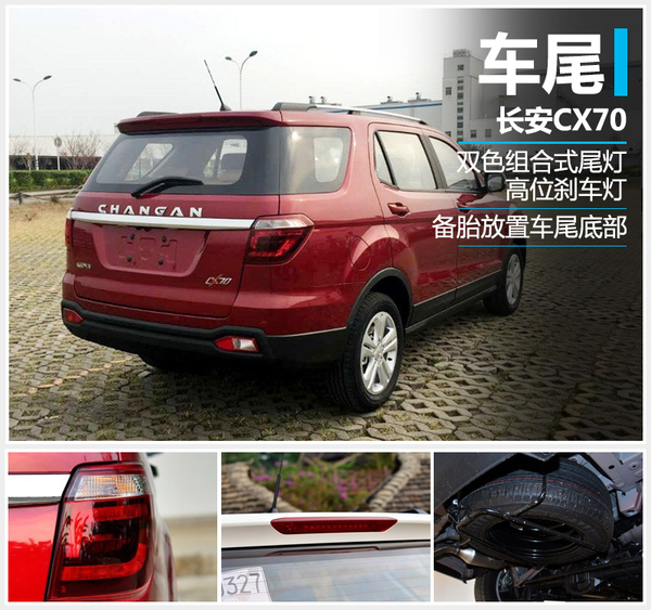 与车头相比,CX70车尾的设计略显紧凑,尾灯中示廓灯采用LED光源。车侧、尾部酷似福特探险者的设计。新车C柱之后设有一个独立车窗,且采用了隐藏式D柱设计。车尾镀铬亮条连接两侧尾灯,镀铬条上方印有长安的拼音标识。新车配备了四个探头倒车雷达以及摄像头,为倒车起到了双重的保护作用。