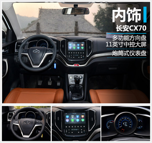 内饰部分,CX70采用左右对称的中控台样式,一条银色装饰线点缀其中。新车座椅采用皮革包裹并使用黑+棕的搭配,最大亮点就是正中的11英寸大屏,屏幕显示效果清晰,具有收音机、手机互联、蓝牙电话的等功能。下部分为空调控制系统,取消了大部分物理按键,整体更具科技感。