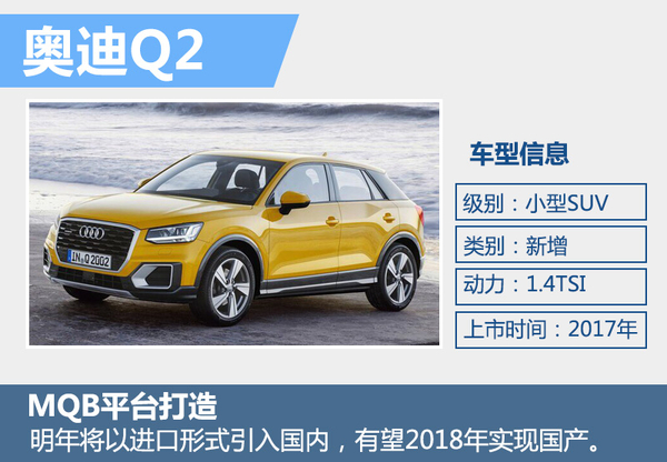 目前奥迪旗下Q系列SUV产品已有中大型Q7、中型Q5和紧凑型Q3三款。在不久前开幕的日内瓦车展上奥迪正式发布了旗下全新小型SUV-Q2。新车基于MQB平台打造,今年秋季率先在欧洲上市销售。网通社与奥迪内部人士获悉,奥迪Q2明年将以进口的形式在国内销售,未来将实现国产搭1.4T发动机。