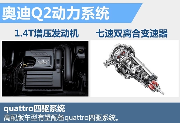 在动力方面,Q2将提供1.0T、1.4T和2.0T多种动力选择,发动机功率范围也从85kW-140kW不等,其中1.0T车型将采用三缸涡轮增压发动机来拉低售价。并且奥迪Q2将全系标配7速S tronic变速器。同时,110kW功率以上高配版车型还将配备quattro四驱系统,用来增强城市公路性能表现。预计在明年将率先以进口的形式引入搭载1.4T涡轮增压发动机的车型。