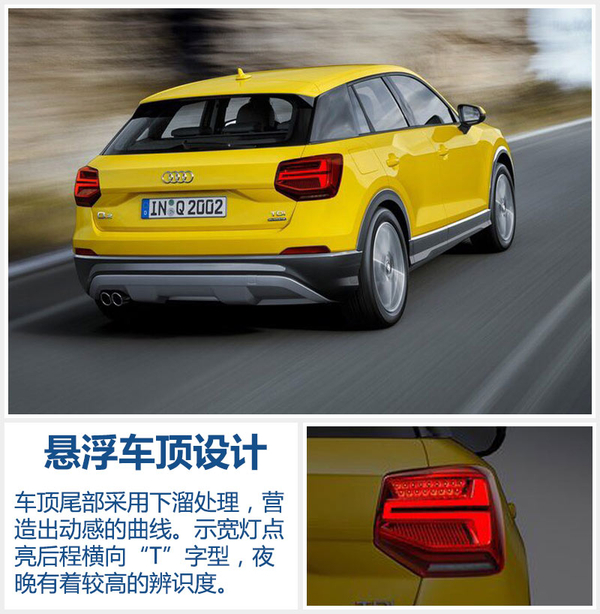 奥迪Q2的车顶尾部采用下溜处理,营造出动感的曲线。黑色亮面C柱使车顶形成悬浮的效果。尾部整体设计简约,但非常饱满,下保险扛底部的银色护板凸显Q2的运动气质。尾灯与大众POLO的造型有些神似,示宽灯点亮后程横向“T”字型,下方还有放射排布的竖线进行点缀,夜晚有着较高的辨识度。排气管采用了单边双出的布局,并使用镀铬进行装饰。