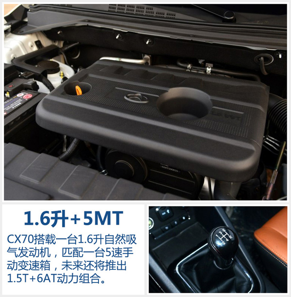 长安CX70搭载一台代号“4G18M2”的1.6升自然吸气发动机,最大输出功率为86千瓦,最大扭矩150牛米。传动部分匹配的是5速手动变速箱,并采用前置后驱的驱动方式。长安汽车品牌公关部部长杨大勇向网通社表示:“CX70除了搭一台1.6升发动机外,还有一台1.5T涡轮增压发动机。”与之匹配的将是一台长安自主研发的全新6速自动挡变速箱,搭载1.5T+6AT这一动力系统的车型有望11月上市。