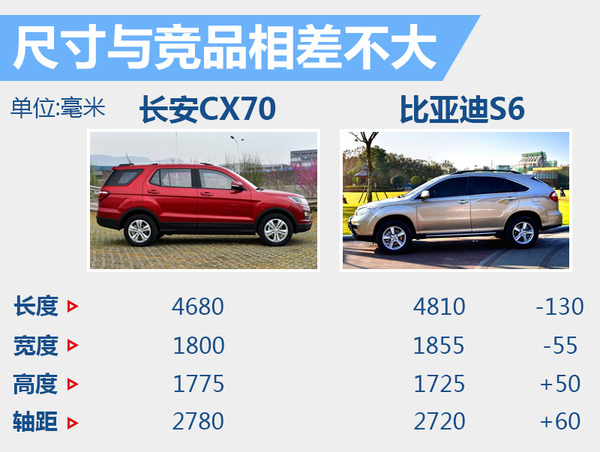 CX70是长安旗下继CX20之后推出的第二款“CX”系列产品,新车定位中型SUV,采用2+3+2排列式的7座布局,这也是长安旗下推出的首款7座SUV。新车已于3月17日正式下线。车身尺寸方面,CX70长宽高分别为4680*1800*1775毫米,轴距2780毫米,相比竞品比亚迪S6而言,在车高和轴距方面占据优势。