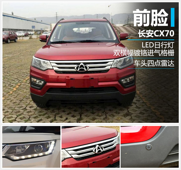 CX70外观方正硬朗,线条平直,带有黑色大包围和车顶行李架。新车采用了三横条镀铬进气格栅设计,与大灯采用了一体化布局。鹰眼式的大灯内部配备了透镜,并且匹配了当下流行的LED日间行车灯。整个前脸采用X型的设计语言。