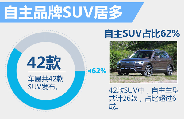 数据显示,今年一季度汽车产销量分别达到659.05万辆和652.67万辆,比上年分别增长6.18%和5.98%。其中,涨幅最高的依然是SUV车型,一季度同比增幅高达51.5%。即将开幕的北京国际车展成为各家车企继续加码SUV市场的第一站。近日,网通社通过对今年北京国际车展将要发布的SUV进行梳理后发现,共31家车企42款SUV将发布。值得一提的是,42款SUV中,包括北汽、长安等在内的自主车型共计26款,占比超过6成。