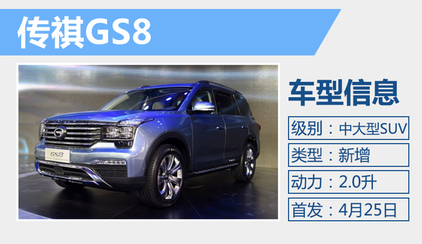 传祺GS8是广汽传祺发力高端市场的第二款产品,新车采用7座设计,定位中大型SUV,基于C平台打造。动力上,GS8有望搭载与GA8相同的2.0升直列四缸涡轮增压发动机。这台发动机由广汽传祺自主研发,最大功率为145千瓦,最大扭矩为300牛米。新车还将提供四驱版本车型。目前在中大型SUV这一细分市场中,自主品牌并没有太多的布局,仅有哈弗H9等产品,长安CS95也将于年内上市,GS8上市后将与上述车型展开竞争。