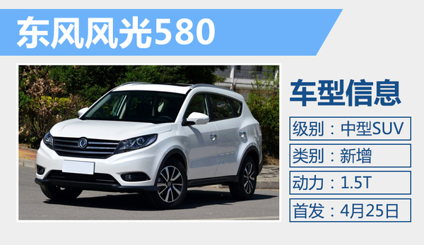 风光品牌旗下首款SUV车型风光580将于今日北京车展首发,新车瞄准中型SUV这一细分市场,其最大的亮点在于装配了一台代号为SFG15T的1.5T涡轮增压发动机,源自菲亚特技术打造,具有高效强劲的特点。数据显示,这台发动机的最大输出功率为110千瓦,百公里综合油耗7.4升。与发动机匹配的是一台6档手动变速箱。
