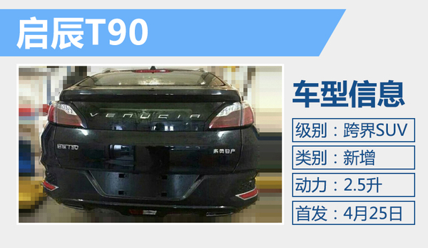 启辰全新跨界中型SUV将于今日北京车展正式发布。从尾部标识来看,新车命名为“T90”,动力方面有望搭载2.5升自然吸气发动机。启辰T70目前采用的是2.0升发动机,根据启辰SUV产品线的命名体系来看,由于T90定位相对要高,因此新车在动力方面有望搭载与东风日产天籁、楼兰等车型相同的2.5升自然吸气发动机,这台发动机型号为QR25DE,最大输出功率为137千瓦,峰值扭矩达到234牛米,与之匹配的是CVT无级变速箱。