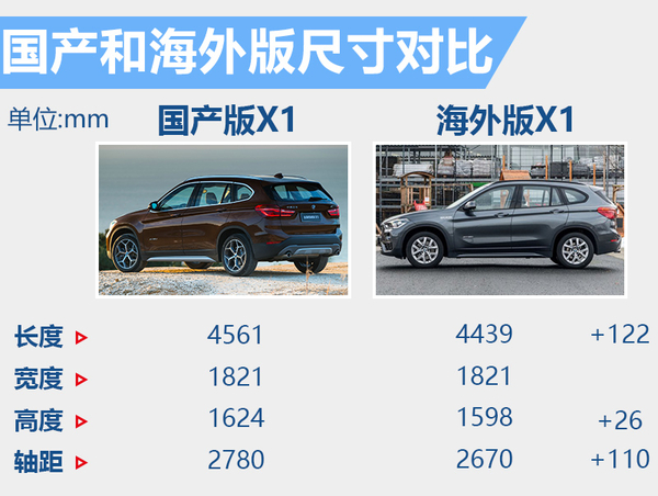 新车在海外版标准轴距的基础上进行了大幅加长,全新国产X1长轴版的整车尺寸长宽高分别达到了4,565*1,821*1,624毫米,轴距达到2,780毫米。相比现款宝马X1的车身尺寸,新车在长、宽、高以及轴距的各项数据中均有不同幅度的加长,其中长度增加81毫米、宽度增加23毫米、高度增加47毫米,轴距部分加长20毫米,但较海外车型却加长110毫米。