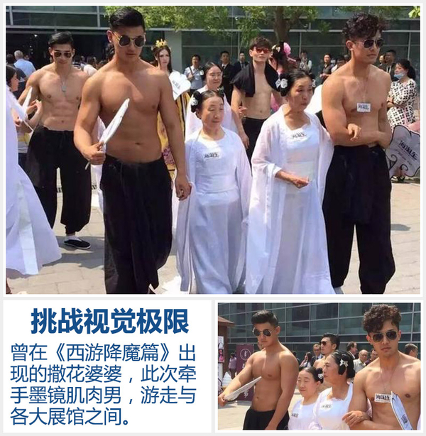 借助明星效应是车企宣传的方式之一,不过也有别样的传播方式。例如某某某公司请来了前日本AV女优、宅男福利的泷泽萝拉来到北京车展,我只看到她身着性感服饰在江铃展台进行摆拍,并更换多套装束,必然让很多狼友们兴奋不已。在车展现场还有曾在《西游降魔篇》里空虚公子的撒花婆婆,此次中牵手墨镜肌肉男,游走与各大展馆之间,为企业进行宣传,同时也不断挑战着大家的审美极限。