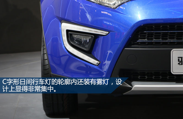 除了“大嘴”进气格栅,两侧激进的C字形日行灯冲撞着你的视觉感官,并且在中间还装有前雾灯,设计上显得非常集中。另外侧面采用了悬浮式车顶设计,腰线富有力量感,而D柱位置还被“抠出”了一个侧窗,不过并没有带来什么功能性,只是视觉上不显单一。在其他方面上窄下宽的格栅风格有着鲜明的江铃驭胜品牌特性,车顶行李架、底盘护板等作为SUV必不可少的物件也都配备。