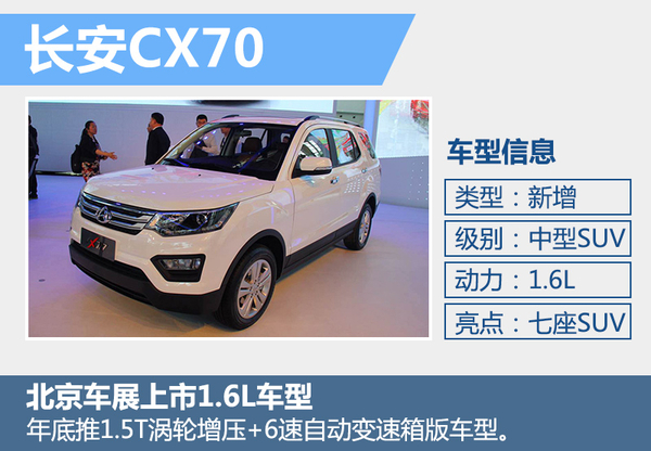 CX70是长安旗下继CX20之后推出的第二款“CX”系列产品,新车定位中型SUV,采用2+3+2排列式的7座布局,这也是长安旗下推出的首款7座SUV。新车在4月25日正式上市,共推出6款车型,官方指导价格区间为6.89-8.49万元。车身尺寸方面,CX70长宽高分别为4680*1800*1775毫米,轴距2780毫米,与同级车相比在车高和轴距方面占据一定优势。动力方面,长安CX70搭载一台代号“4G18M2”的1.6升自然吸气发动机,最大输出功率为86千瓦,最大扭矩150牛米。传动部分,与发动机匹配的是5速手动变速箱,并采用前置后驱的驱动方式。另外,搭载1.5T+6AT这一动力系统的车型有望今年11月上市。