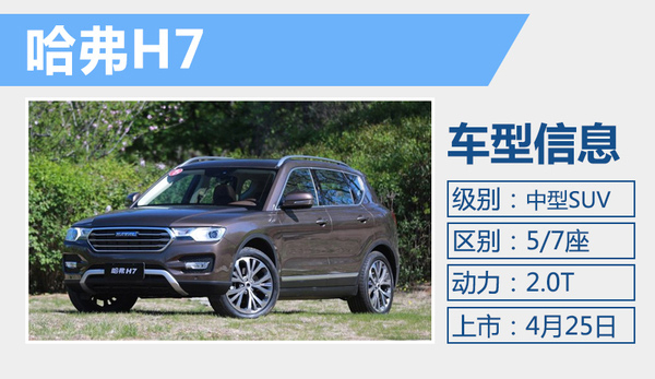 哈弗H7定位于哈弗H8与H6 coupe之间,新车将主打中型SUV市场,车身长宽高分别为4,712毫米、1,925毫米、1,788毫米,轴距则达到了2,850毫米。此次上市仅推出3款5座版车型,售价区间为14.98-16.98万元。命名为H7L的7座版车型将在年底上市,同时采用红色logo与之区分。哈弗H7搭载2.0T涡轮增压直喷发动机,采用双涡流技术,最大功率170千瓦/5500转/分,峰值扭矩355牛·米/2200-4000转/分。该发动机将匹配一台来自格特拉克的6速湿式双离合器变速箱,官方宣布其0-100公里/时加速时间为9.3秒。