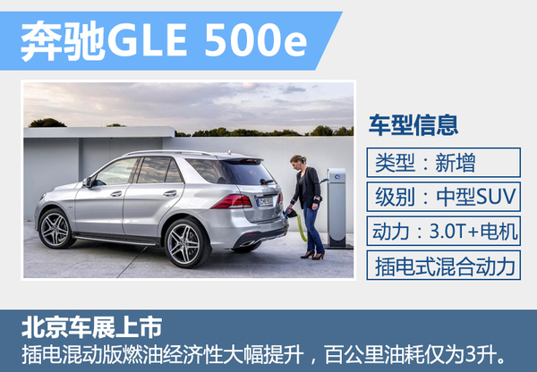 基于普通版GLE打造的GLE 500e插电混动版车型在这次北京车展中正式上市,新车售价为119.8万元。奔驰GLE 500e混动版车型最大的优势在于超强的动力和超低的油耗,GLE 500e的百公里综合油耗仅为3L,较现款GLE 400 4MATIC 9.7L/100km的油耗,节油率达69%。新车将采用3.0T发动机和电动机共同配合工作提供动能,综合最大功率325kW,综合峰值扭矩达到650Nm,并匹配7G-TRONIC自动变速箱。新车可通过充电桩或者家用220V电源充电,充电桩预计充满需2小时。