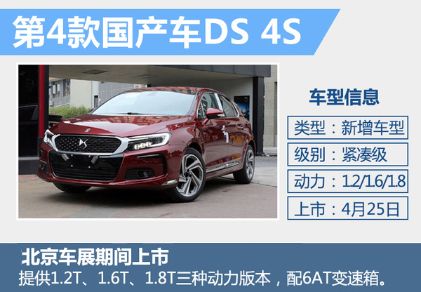 DS 4S延续了DS产品一如既往的精致与考究。外观方面,DS 4S采用全新家族前脸“DS之翼”设计,六边形镀铬边框进气格栅、LED头灯以及“C”字形条状LED日间行车灯,使新车看上去十分动感。内饰方面,新车采用了真皮内饰及座椅,仪表台、门护板等大面积覆盖真皮,搭配表链式座椅设计、真铝材质装饰以及氛围灯等。以排量大小命名的车型名称“THP130”、“THP160”和“THP200”分别搭载1.2T、1.6T和1.8T这三款THP发动机,最大功率分别达到100、123千瓦和150千瓦。
