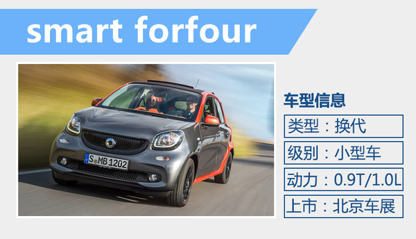 smart forfour作为smart家族的首款5门4座车型,新车在长度和轴距上都进行了大幅加长,整车尺寸长宽高分别为3,490*1,660*1,550毫米,轴距更是达到2,494毫米,相比smart fortwo新车的长度和轴距分别增加795、621毫米。另外,全新smart fortwo的轴距也与MINI coupe的 2,495毫米的轴距数值接近,新车在乘坐空间以及实用性上表现将更为出色。动力方面,新车将提供一款涡轮增压和一款自然吸气发动机,其中0.9T涡轮增压发动的最大输出功率为66kW,峰值扭矩达135千瓦;1.0升自吸发动机的最大功率和扭矩分别是135牛米、91牛米。传动方面,与之匹配的是一款6速双离合变速箱。