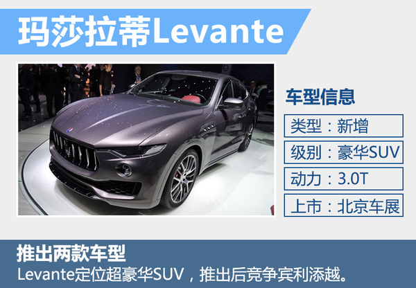 玛莎拉蒂旗下的首款SUV车型Levante在此次北京车展中正式上市,新车共推出两款车型,分别为3.0T低功率版Levante和3.0T高功率版的Levante S,售价分别为99.98万和147.8万元,新车预计在今年7月份交付到中国车主手中。玛莎拉蒂Levante采用了家族标志性的多边形前进气格栅,格栅内部的直瀑式镀铬条幅比较简洁。内饰的方面内饰借鉴了Ghibli的设计,并使用大量的皮质包裹来凸显豪华度。(网通社 2016年4月26日 北京报道)