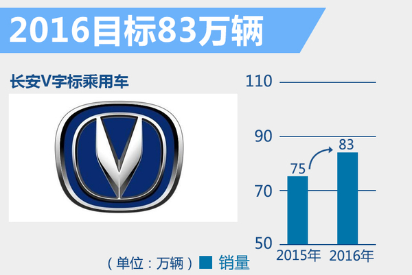 据长安汽车公布的数据显示,2015年,长安品牌乘用车(V字标品牌)累计销售75万辆。其中两款SUV表现突出,CS75全年销售17.4万辆;CS35累计销售16万辆。根据长安汽车规划,今年V字标品牌将销量目标提升至83万辆。这意味着2016年销量要同比去年增长10%以上。新SUV的推出将为这一目标提供助力。