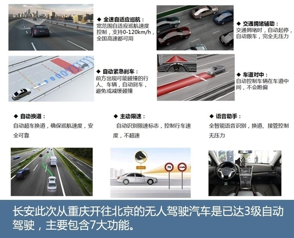 长安此次从重庆开往北京的无人驾驶汽车,是智能化等级的三级水平。根据长安规划,最快2019年将全部搭载在量产车型上。涉及全速自适应巡航、交通拥堵辅助、自动紧急刹车、车道对中、自动换道、主动限速、语音助手7大主要功能。(网通社2016年4月26日北京报道)