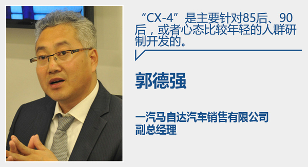 与沉稳、内敛的传统设计风格相比,采用年轻化设计理念的车型越来越受到广大消费者的青睐。马自达此前在外观造型方面,推出了全新的“魂动”设计语言,动感年轻的造型成为了助推马自达销量业绩的原动力。全新“魂动”车型CX-4已于马自达之夜完成了全球首秀,新车将在一汽马自达投产,一汽马自达副总经理郭德强与网通社沟通时表示:“CX-4是主要针对85后、90后,或者心态比较年轻的人群研制开发的。”新车将于今年6月上市,上市后将携手阿特兹组成“魂动”双车阵容,正式开启品牌年轻化模式。
