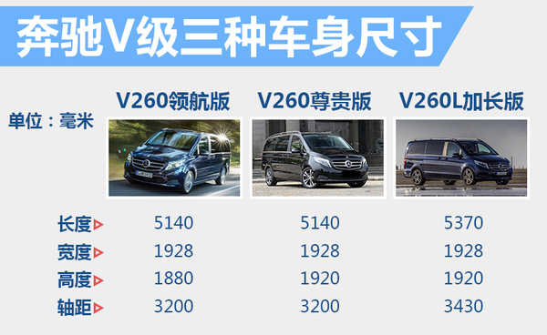 福建奔驰拥有戴姆勒集团在海外唯一的商务车研发中心,这样的优势在于,引入国内的车型根据中国市场的消费需求做出调整,就奔驰V级而言,此次推出三款不同车型,并包含一款长轴距版。其中V260领航版和V260尊贵版的长度、宽度和轴距分别为5,140毫米、1,928毫米和3,200毫米,仅在车身高度有所不同,分别为18,80毫米和1,920毫米。而V260L尊贵加长版的长、宽、高分别为5,370*1,928*1,920毫米,轴距则为3,430毫米。