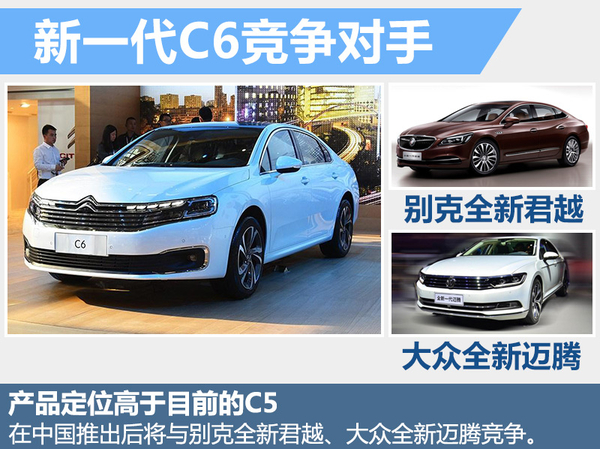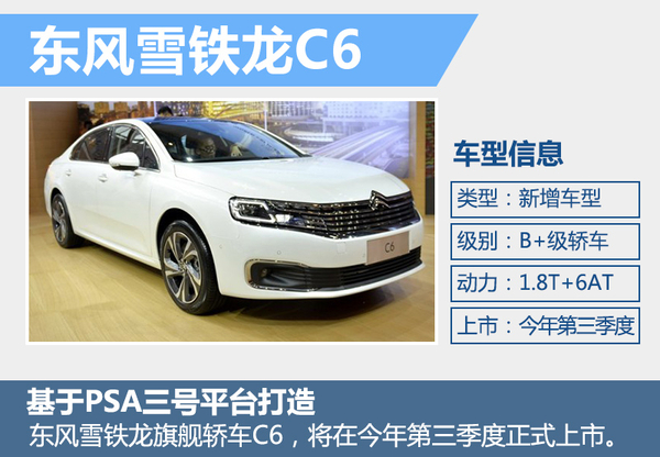 在今年的北京车展上,东风雪铁龙全新旗舰车C6进行了全球首次亮相。新车基于PSA三号平台打造,由位于湖北武汉的神龙第二工厂进行投产。陈庆丰先生在与网通社沟通时表示:“东风雪铁龙C6将在今年下半年9、10月份上市。”对于这款全新旗舰级轿车的市场定位,陈庆丰谈到:“我们将新一代C6定义为一款B+级别的轿车,对于新一代C6的竞争对手,主要是别克全新君越和即将上市的全新迈腾。”动力方面,东风雪铁龙C6搭载PSA集团研发的1.8升THP直列4缸涡轮增压发动机,最大功率可达150千瓦,峰值扭矩为280牛米。传统系统部分,与发动机相匹配的是6速手自一体变速箱。