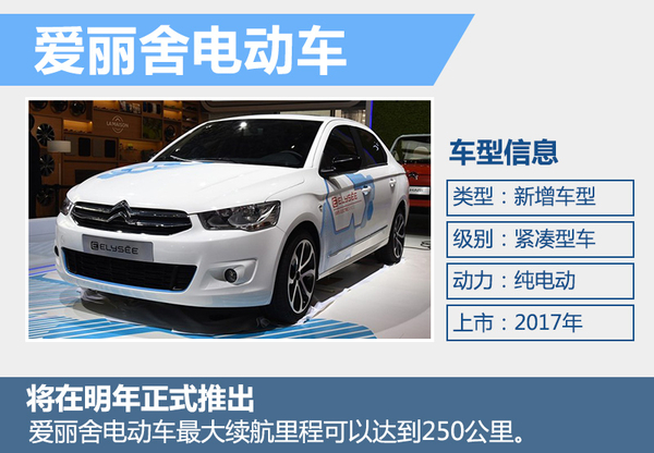 | 爱丽舍电动车 | 紧凑型轿车 | 2017年 |