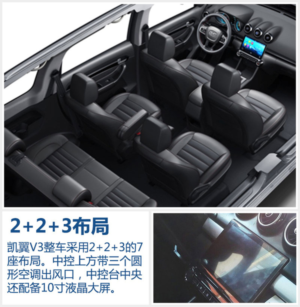 在座椅布局上,凯翼V3整车采用2+2+3的7座布局。内饰造型也是沿用了凯翼X3的风格设计,中控上方的三个圆形空调出风口十分醒目。此外,中控台中央还配备了10寸液晶大屏,并且拥有iCar 1.0车智能互联功能。凯翼V3采用全黑内饰,空间更大、整体更简洁,搭配皮质包裹的座椅更符合7座家用车的特性。