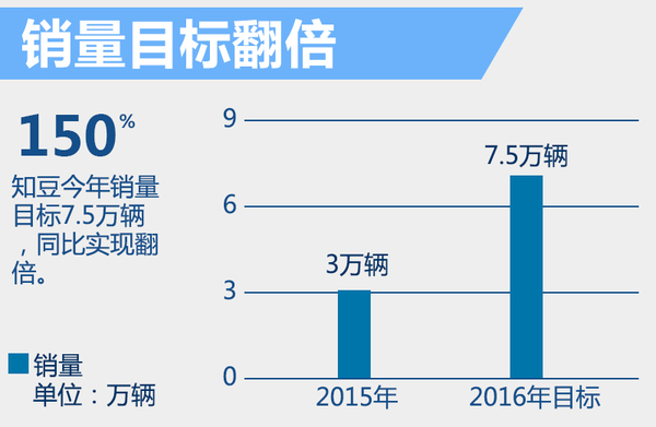 通过在私人消费市场和分时租赁领域的双重发力,知豆汽车年销量正逐步提升,从2014年,正式在国内市场销售7400多辆,到2015年销售突破3万辆,占据国产新能源汽车近10%的市场份额,知豆迅速获得了部分市场的认可和消费者的青睐。据悉,知豆今年销量目标为7.5万辆,相比去年的销量成绩,将实现翻番。