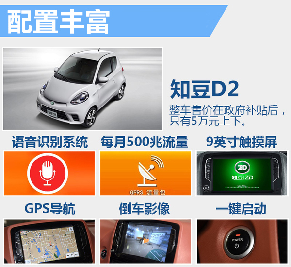 在目前的技术条件下,决定续航里程的核心要素就是车载电池的容量。电池成为电动车成本的大头,这也是目前续航里程高的电动汽车,价格居高不下的主要原因。由于知豆续航里程控制在合理范围(180公里),节省的电池成本让知豆的售价在政府补贴后,只有5万元上下。知豆D2却拥有先进的语音识别系统(与科大讯飞合作)、每月500兆免费流量,9英寸触摸屏、语音导航、倒车影像、一键启动等高配置,消费者获得更大的实惠。(网通社2016年4月29日北京报道)