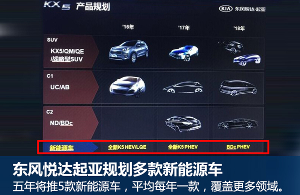 根据东风悦达起亚的新车计划,企业将于2018年前推出13款新车(含KX5)。包括4款SUV、2款小型车(即图中C1)、紧凑型车(即图中C2)以及4款新能源车。东风悦达起亚新能源车型销量目标为5万台,企业还将于2020年前推出多款新车。金坚表示:“东风悦达起亚今年是首款新能源车型是K5混动,明年会有K5插电式混动车,18年和19年期间,会推出K3插电式和纯电动车,2020年推出KX3纯电动车。”