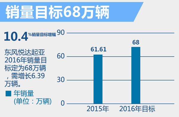 东风悦达起亚2015年推出了新款KX3和全新一代K5,两款车型的推出令东风悦达起亚无论在SUV端,还是在轿车端的竞争实力大幅提升。2016年东风悦达起亚将销量目标定为68万辆,需要在2015年61.61万销量的基础上提升10.4%。不过,东风悦达起亚接下来将斥巨资研发新技术,研发新车型,有望完成销量目标。