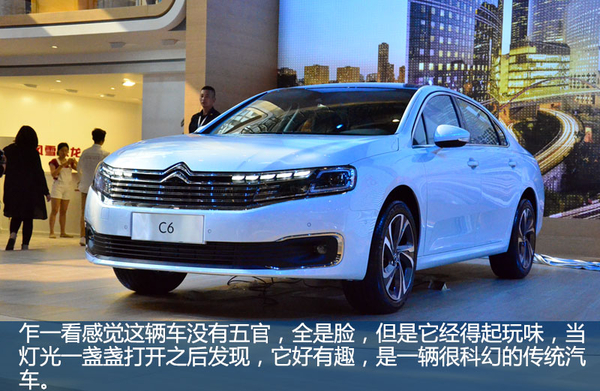 好丑啊~这就是东风雪铁龙发布的全新旗舰车C6?”——当我在车展现场对C6进行实拍的时候听到旁边飘来这样一句。但是我想说,它经得起玩味,当灯光一盏盏打开之后发现,它好有趣,是一辆很科幻的传统汽车。新车是基于EMP2平台打造,级别定位在中大型车,将于今年第三季度上市,与长安福特金牛座、上汽通用别克新君越、一汽丰田皇冠等车竞争。