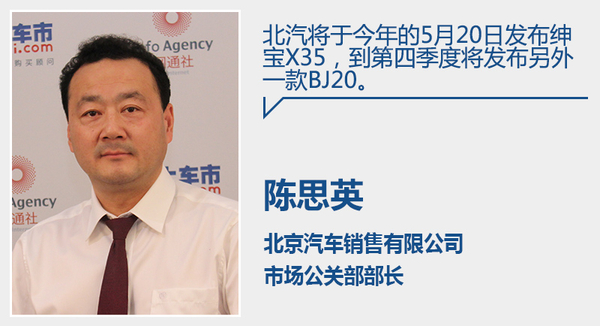 北汽自主从去年3月份开始,向市场投放了绅宝首款SUV车型——紧凑型SUV X65,12月份推出了绅宝小型X25,又于今年1月份推出了两一款紧凑型SUB X55,产品投放速度明显加快。陈思英表示:“去年的3月份我们投放市场的是X65,接着是X25是在去年的12月12日。今年的1月10日发布了X55。到了今年的5月20日将发布X35,到第四季度将发布另外一款BJ20,都是SUV。基本上15年、16年,可以定义为北京汽车自主品牌SUV元年。一方面是契合市场发展需要,一方面是我们的产品也到了推向市场的时候。最近投放的几款产品。”