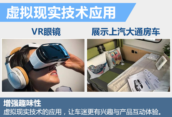 除了自动驾驶外,应用虚拟现实技术的VR眼镜头盔等设备,也被车企带到了北京车展,借助该技术让车迷与自家汽车产品进行互动体验。比如上汽大通房车为了展示其“车轮上的家”,设置了VR互动体验区。观众戴上VR眼镜后,眼前场景是一辆停在草坪上的房车,通过操纵手柄,可以进行展开桌子、打开遮阳棚、展开床铺等多个操作,细致入微地观察这款房车的方方面面。在此之前的成都车展,荣威360上市发布会同样采用了VR眼镜展示产品性能,让到场的嘉宾媒体惊叹不已。