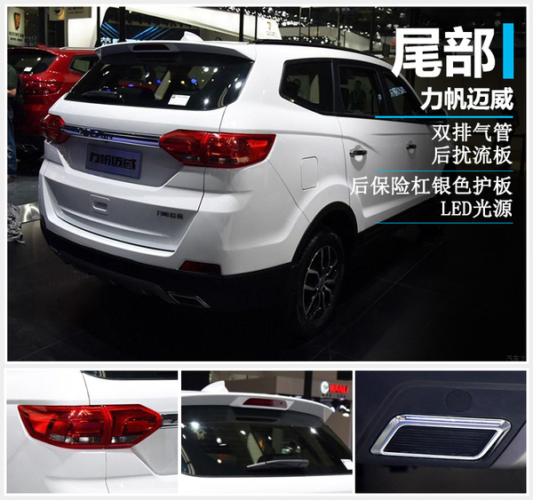 力帆迈威的前脸采用了时下较为流行的“大嘴”式设计,并利用镀铬材质来修饰中网。我们从图片中可以看到,“LIFAN”品牌标识悬挂中网之间,这点在力帆其他车型上是不多见的。此外,银色下护板的配备既可以对车辆起到保护作用,又为其“颜值”加分不少。