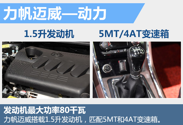 力帆迈威搭载型号为LF475Q-h的1.5升自然吸气发动机,最大功率为80千瓦,峰值扭矩145牛·米。传动系统方面,与该发动机匹配的是5速手动变速箱和4速自动变速箱。在对车辆悬挂系统的选择上,力帆迈威使用了前麦弗逊式独立悬架与导向杆式非独立后悬架的结构。