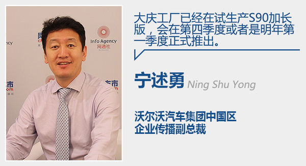 沃尔沃S90在今年北京车展开幕式当天完成了在华“首秀”,并公布了预售价格区间为57-72万元人民币,随后新车将于今年年底前在华上市。对此,宁述勇先生介绍道:“我们将会以进口形式引进390台S90,进口车型是典藏高级定制版本。”同时,沃尔沃针对中国市场的布局将不仅仅局限于标准轴距车型。宁述勇先生补充道:“之后,沃尔沃会在中国生产加长版,由大庆工厂生产,同时销往全球。”目前,全新SPA平台已经成功导入沃尔沃大庆工厂。而对于这款新车的上市时间,宁述勇先生表示:“大庆工厂目前已经在试生产S90加长版,新车会在第4季度或者是明年第1季度推出。”