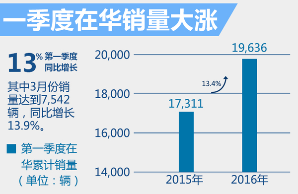 2016年第一季度,沃尔沃汽车在全球累计销量达到120,591辆。而在销量最高的单一市场中国,沃尔沃汽车在今年第一季度实现销售19,636辆新车,相比去年同期17,311辆的销量,同比增长13.4%。其中,沃尔沃汽车在3月份的单月销量达到7,542辆,较去年3月份6,620辆的销量,同比上涨13.9%。同时,对于今年接下来几个月时间里沃尔沃在中国市场的表现,宁述勇先生补充道:“今年的目标是保持一个两位数的增长。”