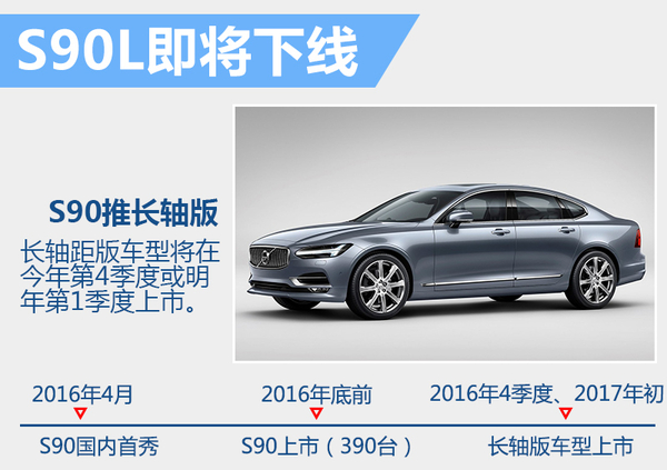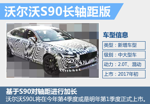 2016年第一季度,沃尔沃汽车在华销量同比增长13.4%,达到19,636辆。销量利好的同时,沃尔沃S90在今年的北京车展期间正式迎来了国内首秀。而在这款豪华中大型轿车正式上市后,沃尔沃还会基于进口车型推出S90的长轴距版。沃尔沃汽车集团中国区企业传播副总裁宁述勇先生在与网通社沟通时表示:“大庆工厂已经在试生产S90加长版,会在今年第4季度或者是明年第1季度正式推出。”S90长轴距版将会在沃尔沃大庆工厂进行投产,新车有望命名为“S90L”,轴距有望突破3米。