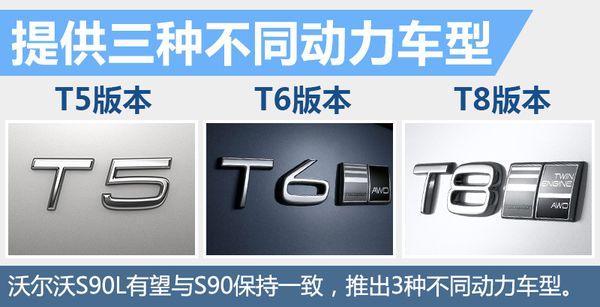 沃尔沃S90L有望沿用进口版车型的动力总成,推出包含T5、T6以及T8在内的三种不同动力车型。其中,T5车型将搭载一台最大功率为187千瓦、峰值扭矩为350牛米的2.0T涡轮增压发动机。T6版本会搭载一台最大功率为235千瓦、峰值扭矩达到400牛米的2.0T机械加涡轮双增压发动机。而T8版本则为插电式混合动力车型,除了配有一台2.0T涡轮增压发动机外,还搭载一台最大功率为64千瓦,峰值扭矩为240牛米的电动机。与发动机匹配的传动系统,预计是8速手自一体变速箱。