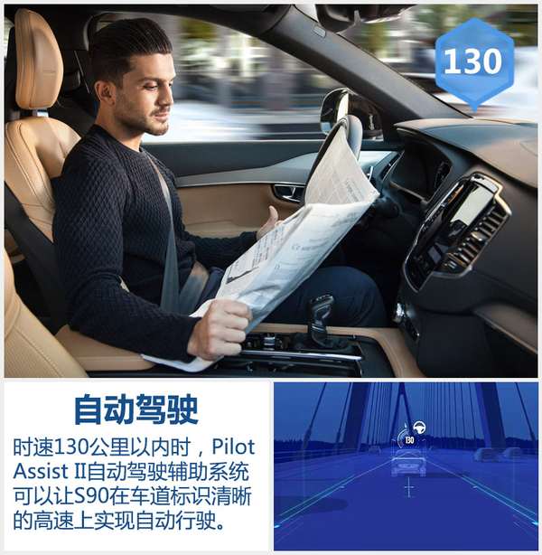 S90搭载了沃尔沃最新的自动驾驶技术,无论白天还是黑夜都能够自动侦测行人、大型动物和骑行的自行车,避免碰撞发生,并可在关键时刻实现自动刹车。同时,新车还配备高度自动驾驶技术Pilot Assist,时速在130公里以内时可在高速公路上沿清晰可辨的车道标识行驶及转向。沃尔沃汽车集团研发高级副总裁彼得•默滕斯(Peter Mertens)此前透露:“沃尔沃全新S90配备的Pilot Assist高度自动驾驶技术将在美国、中国和欧洲分别进行标准测试,以保证在不同路况下的表现一致。”即将从大庆工厂下线的S90L,预计也将会配备同样的自动驾驶技术。
