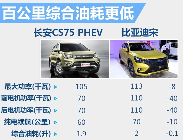 目前市场上插电式混动SUV车型并不多见,比亚迪宋同样为插电式混动车型。长安CS75 PHEV上市后将与比亚迪宋展开竞争。比亚迪宋搭载一台1.5T发动机,最大功率为113千瓦,前、后电机最大功率均为110千瓦,纯电续航里程70公里。与比亚迪唐相比,CS75 PHEV在百公里综合油耗上占优势。(网通社2016年5月4日北京报道)