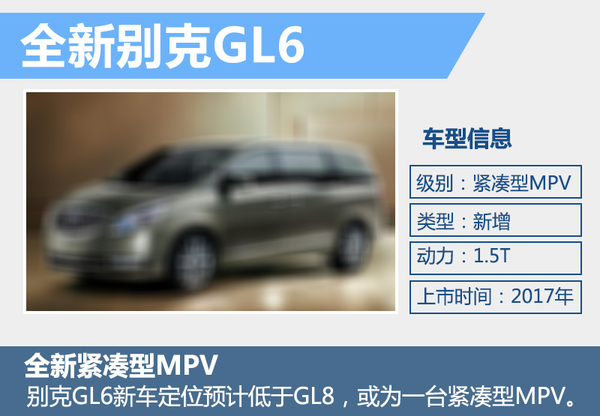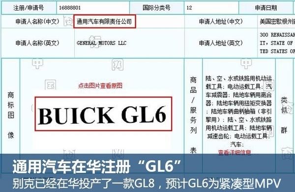 网通社从国家工商行政管理总局商标局获悉:上汽通用已注册了名为"GL6"的商标。从别克产品命名体系来看,新车定位预计低于GL8,有望为一台紧凑型MPV。目前,别克正在华推进小排量发动机战略,GL6有望搭载一台1.5T涡轮增压发动机,最大功率124千瓦,峰值扭矩250牛米。
