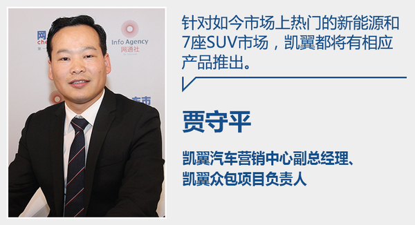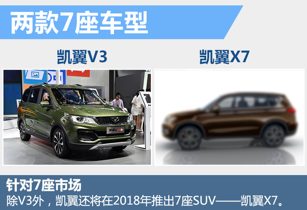 “近年随着消费者对旅游休闲等需求的增强及二胎放开等政策变化,消费者的购车理念逐渐转变,7座SUV等功能型汽车产品热销。”贾守平说道。针对该细分领域,今年凯翼将上市的V3定位7座智能SUV,该车将于今年8月正式上市,同时,凯翼规划打造更为标准的7座SUV——凯翼X7,新车将于2018年正式上市。此外,凯翼已发布亮相的全新A级SUV,将于今年6月推向市场。
