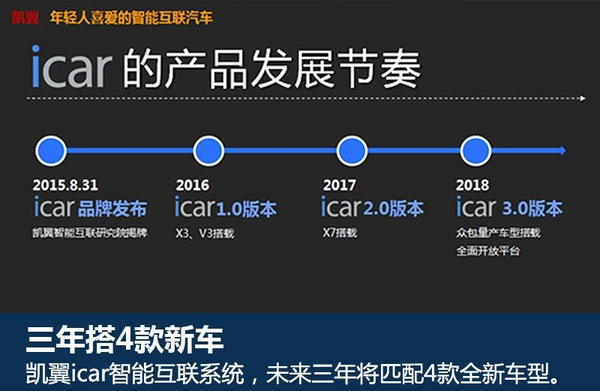 与传统车企造车理念略有不同,凯翼汽车强调“众包”与“互联网汽车”概念。凯翼此前发布了icar智能互联系统,该系统在未来三年内将会匹配4款全新车型。按照规划,icar1.0版本将会在今年匹配到X3和V3之上,icar2.0版本会在2017年匹配到凯翼7座SUV车型——X7,2018年icar系统将会推出3.0版本同时匹配到众包量产车型(或为凯翼X5)。凯翼汽车未来将规划C系列、X系列和V系列三条产品线,分别对应轿车、SUV和MPV三个市场,而“互联网汽车”产品理念将贯穿未来所有产品。