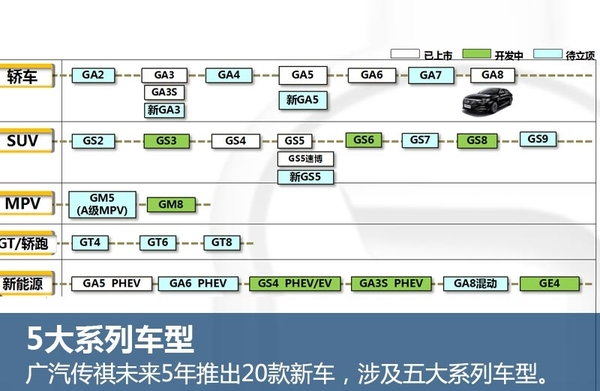 根据广汽传祺规划:未来5年将陆续投放20-30款新车型。轿车从GA2到GA8七款产品;SUV从GS2到GS9共有八款产品;MPV方面2017年推出中大型GM8,还有一款中型GM5。此外传祺还将推出“GT”轿跑系列,全面提升传祺品牌竞争力。新能源方面未来五年还将推出至少7款新产品。