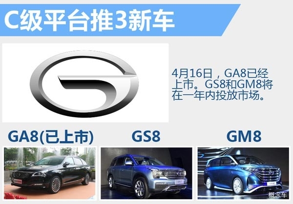 GS4的推出标志着广汽传祺进入2.0时代。在完成紧凑级轿车、SUV布局后,传祺2.0时代的一大重点是进军更高端车的乘用车市场。在北京车展上,基于全新C级车平台打造的GA8、GS8、GM8三款中大型车集中亮相,覆盖轿车、SUV、MPV三大领域。GA8今年4月已经上市,另外两款车也将在明年4月底前陆续投放市场。一年推出三款高端车,这对于传祺来说是很大的挑战。