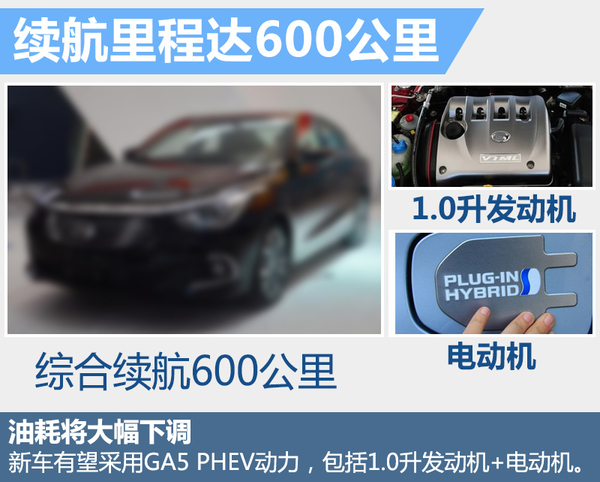 GA6 PHEV有望采用GA5 PHEV的动力配置,包括由一台1.0升自然吸气发动机和一台 94千瓦的电机共同驱动。搭载这一系统的GA6 PHE纯电续航里程有望达到80公里,综合续航里程也同样有望与GA5 PHEV一样达到600公里。目前GA6汽油版车型的百公里油耗为6.1升,采用插电式混动动力系统之后,油耗将大幅下降。